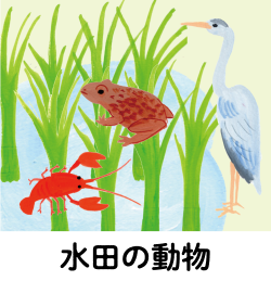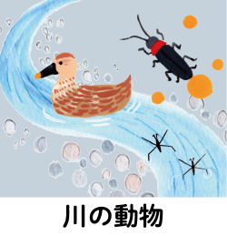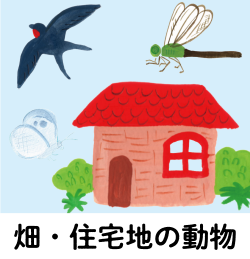 分類は、動物に関しては昆虫から魚や鳥のほか鹿やイノシシなどの大型動物まで多種類見られますが、できるだけ身近に見られる動物を川や田園などに区分けしてまとめました。また、植物についても草花から樹木まで幅広くありますが、地区ごとによく見られる代表的な植物をまとめました。