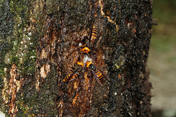 頭部は黄色、腹部は黒色と黄色の縞模様。
