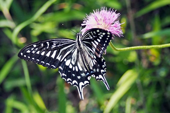 大型で黒と黄色のまだら模様。ミカン科の植物を食用とする。