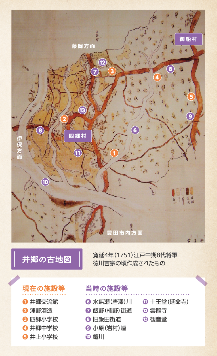 江戸幕府が樹立された1600年頃、四郷村は9百〜千石で内藤氏の挙母領となり、御船村は5百石ほどで本多氏の足助領となるなど、いくつかの旗本知行所に分けられていた。両村とも江戸時代は名古屋と飯田方面を結ぶ信濃道(後の飯田街道)が通過しており、中馬の道とも呼ばれ、馬の背に荷物を載せた人馬が行き交う交通の要所であった。これらの大通りを通称大還と呼んだ。文化8年(1811)3月25日には、幕府の命を受けた地図測量の伊能忠敬が四郷村に宿泊し、翌日には猿投神社まで測量を実施したと記録がある。