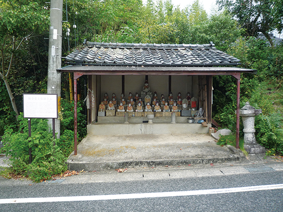 8.観音堂と弘法さん 明治末期、お鍬山全体に八十八の祠を造り、弘法さんの石仏を安置した。麓には本堂も造られ親弘法の像を祀り、近郷近在の人たちで賑わった。昭和38年に土地所有者が外部の人に代わったため、下古屋の弘法さんは延命寺に、天道は観音堂に安置された。毎年旧暦の3月21日に弘法さんを祀っている方々が祭りを行っている。観音堂は四郷村戸長役場であった。明治22年上郷村への合併で村役場が花本に置かれ、以後、四郷区の集会所として使われていた。 MAP